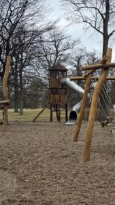 Na placu zabaw jest wiele stref. Są tu piaskownice, domki ze zjeżdżalniami, tor przeszkód i wieże wspinaczkowe. Każdy znajdzie coś dla siebie, niezależnie od wieku.